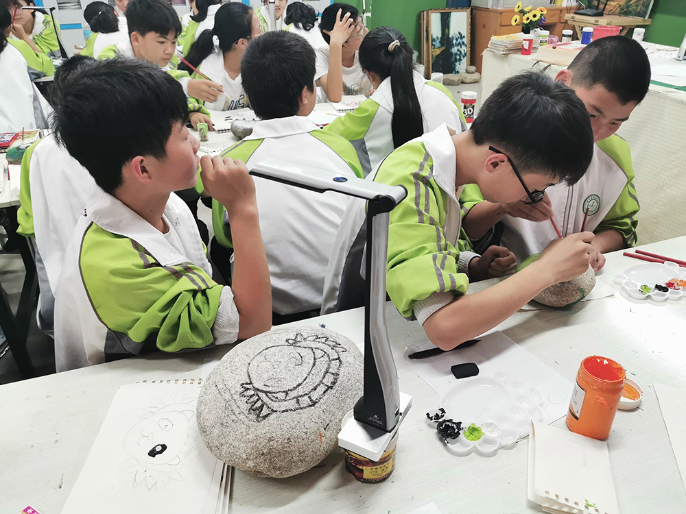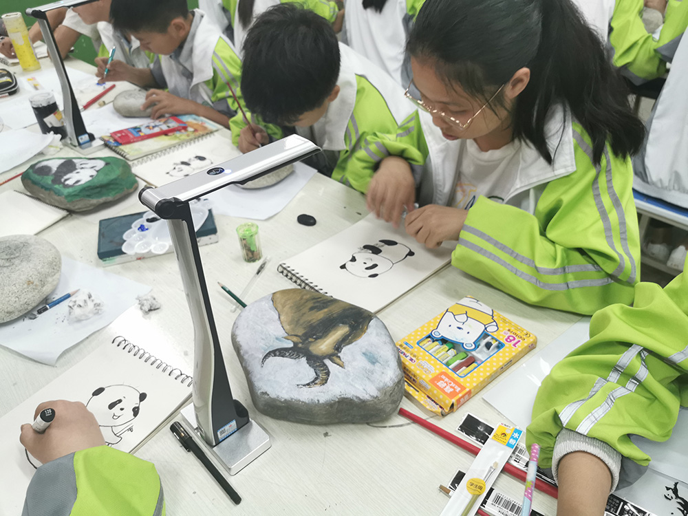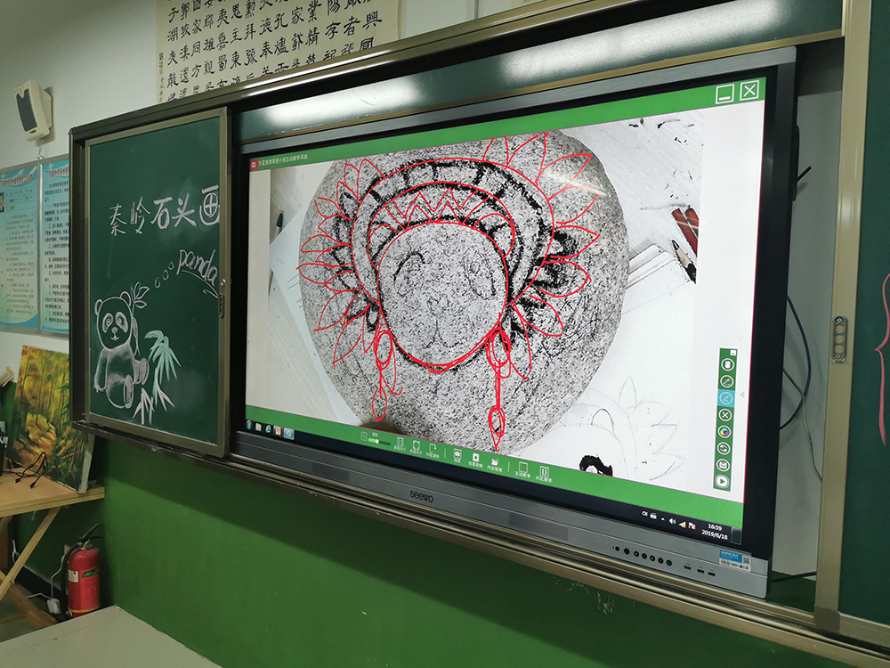 在熊貓石頭畫美術(shù)課上,師生們正在使用吉星捐贈(zèng)的未來智慧美術(shù)全互動(dòng)系統(tǒng)進(jìn)行美術(shù)教學(xué)。