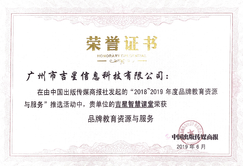 由中國出版傳媒商報社發起的“2018~2019年度品牌教育資源與服務”推選活動中,吉星智慧課堂榮獲“品牌教育資源與服務”榮譽稱號。