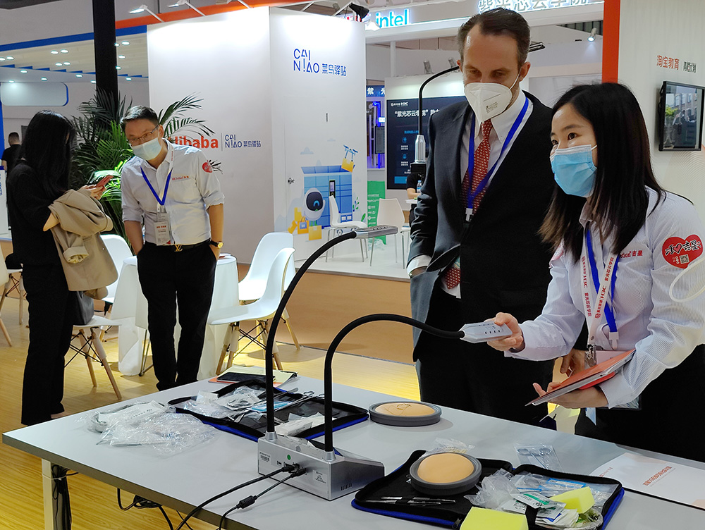 現場最吸睛的莫過于是實訓5G無線全錄播系統展區了,來往的觀眾紛紛舉起了手機拍攝系統運行的過程,精心布置的展區現場直觀展示了全錄播系統與繪畫、烹飪、醫護、電子雕刻等不同職教場景的高度融合。