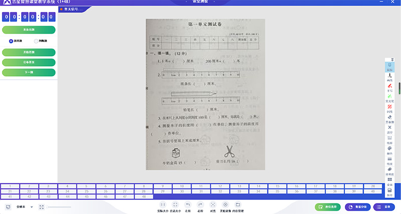 教師通過大屏展示測驗考題,將紙質試題轉化電子形式展示,節約成本的同時也能夠讓學生清晰地看到試題。學生通過按鈕進行作答,大屏實時展示答題狀況。