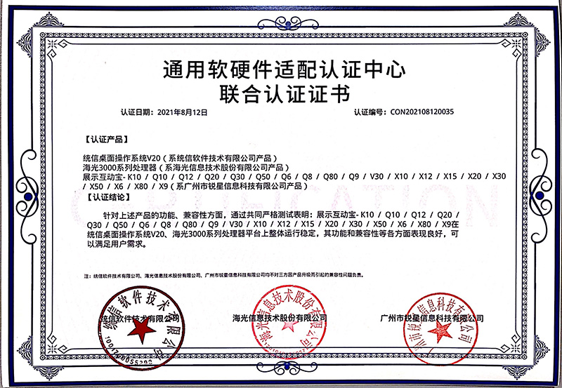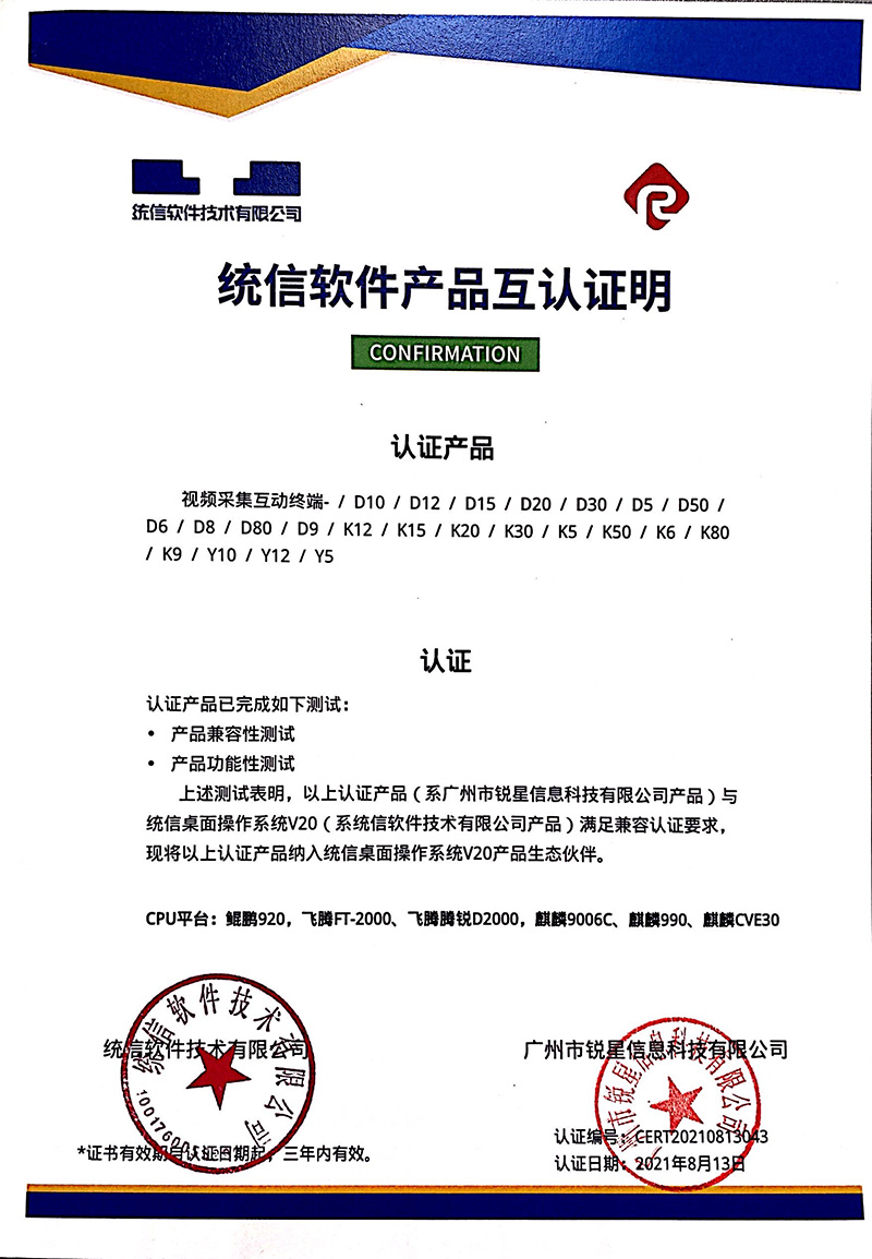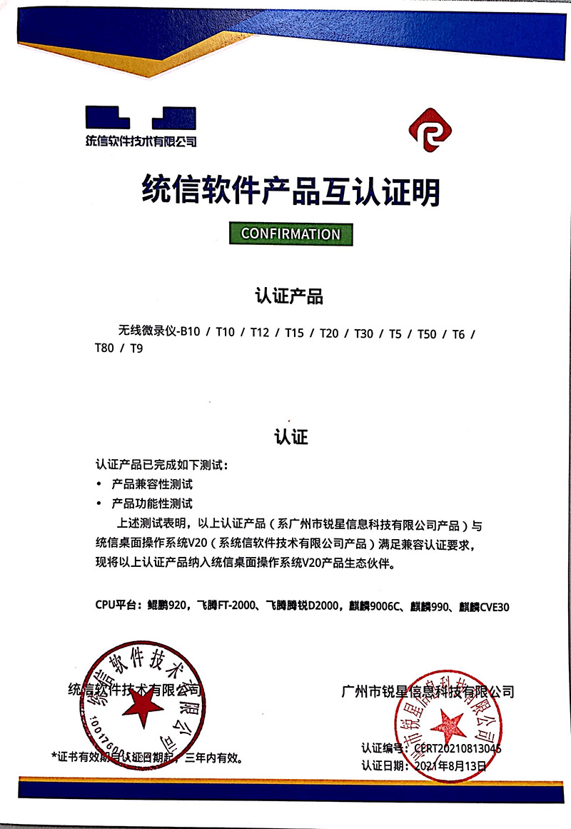 統(tǒng)信認(rèn)證證書(展示互動(dòng)寶、無線微錄儀)
