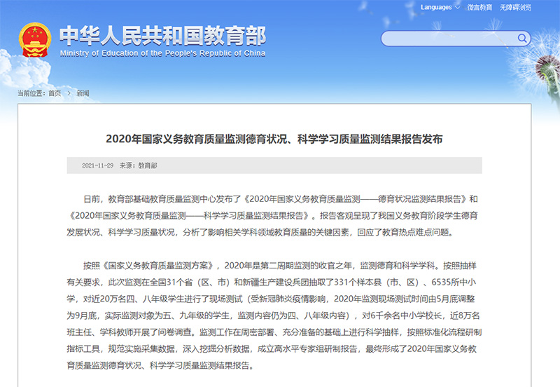 日前,教育部基礎(chǔ)教育質(zhì)量監(jiān)測(cè)中心發(fā)布了《2020年國(guó)家義務(wù)教育質(zhì)量監(jiān)測(cè)——德育狀況監(jiān)測(cè)結(jié)果報(bào)告》和《2020年國(guó)家義務(wù)教育質(zhì)量監(jiān)測(cè)——科學(xué)學(xué)習(xí)質(zhì)量監(jiān)測(cè)結(jié)果報(bào)告》。