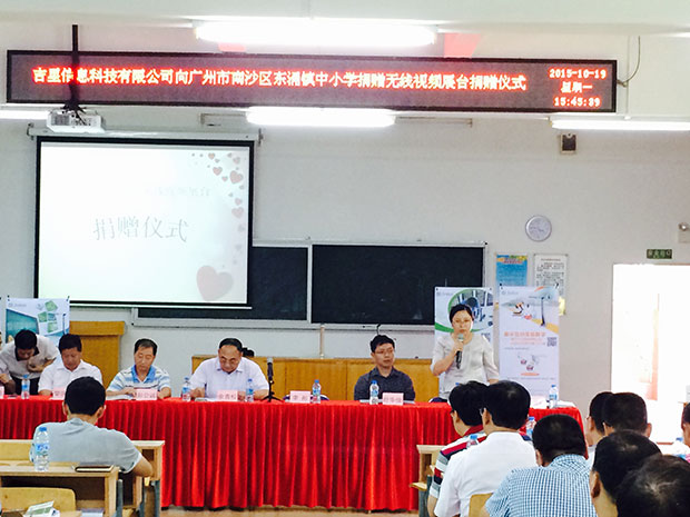 2015年10月19日下午三點,吉星信息科技有限公司向廣州南沙區東涌鎮中小學捐贈無線視頻展臺捐贈活動在東涌第一小學舉行,本次捐贈活動出席人員有廣州市教育裝備中心領導、南沙區教育局領導及南沙區東涌鎮26個中小學的校長和代表等60余人。